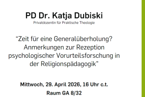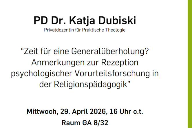 Dr. Katja Dubiski (Privatdozentin für Praktische Theologie) wird am Mittwoch, den 29. April 2026 um 16 Uhr c.t. in Raum GA 8/32 ihre Antrittsvorlesung halten. Die Vorlesung trägt den Titel: “Zeit für eine Generalüberholung? Anmerkungen zur Rezeption psychologischer Vorurteilsforschung in der Religionspädagogik”. Anmelden können Sie sich hier.
