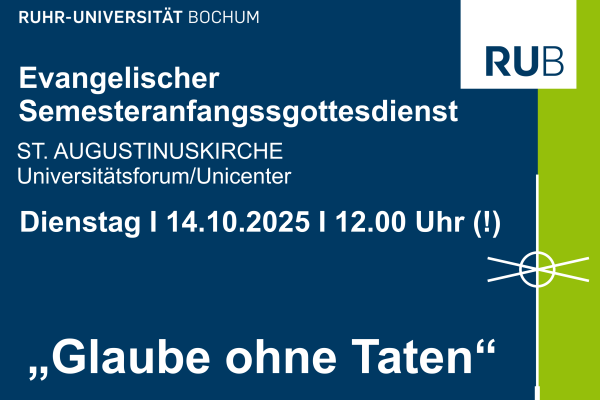 Herzlich laden wir zum evangelischen Semesteranfangsgottesdienst am Dienstag, dem 14.10.2025, um 12:00 Uhr (!) in die Kirche St. Augustinus im Universitätsforum (Unicenter) ein. Der Gottesdienst steht unter dem Titel „Glaube ohne Taten“ (Jak 2,14-26).