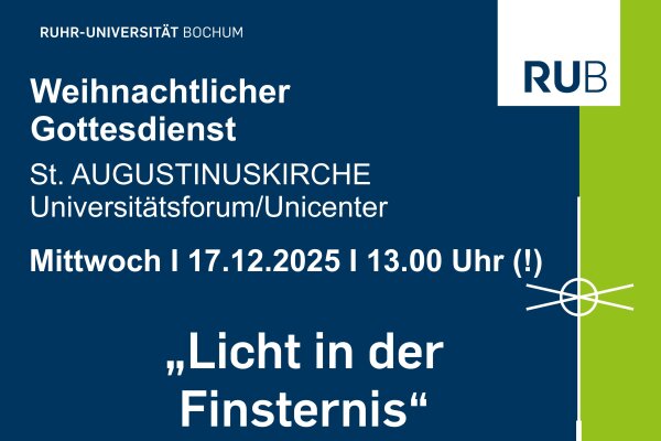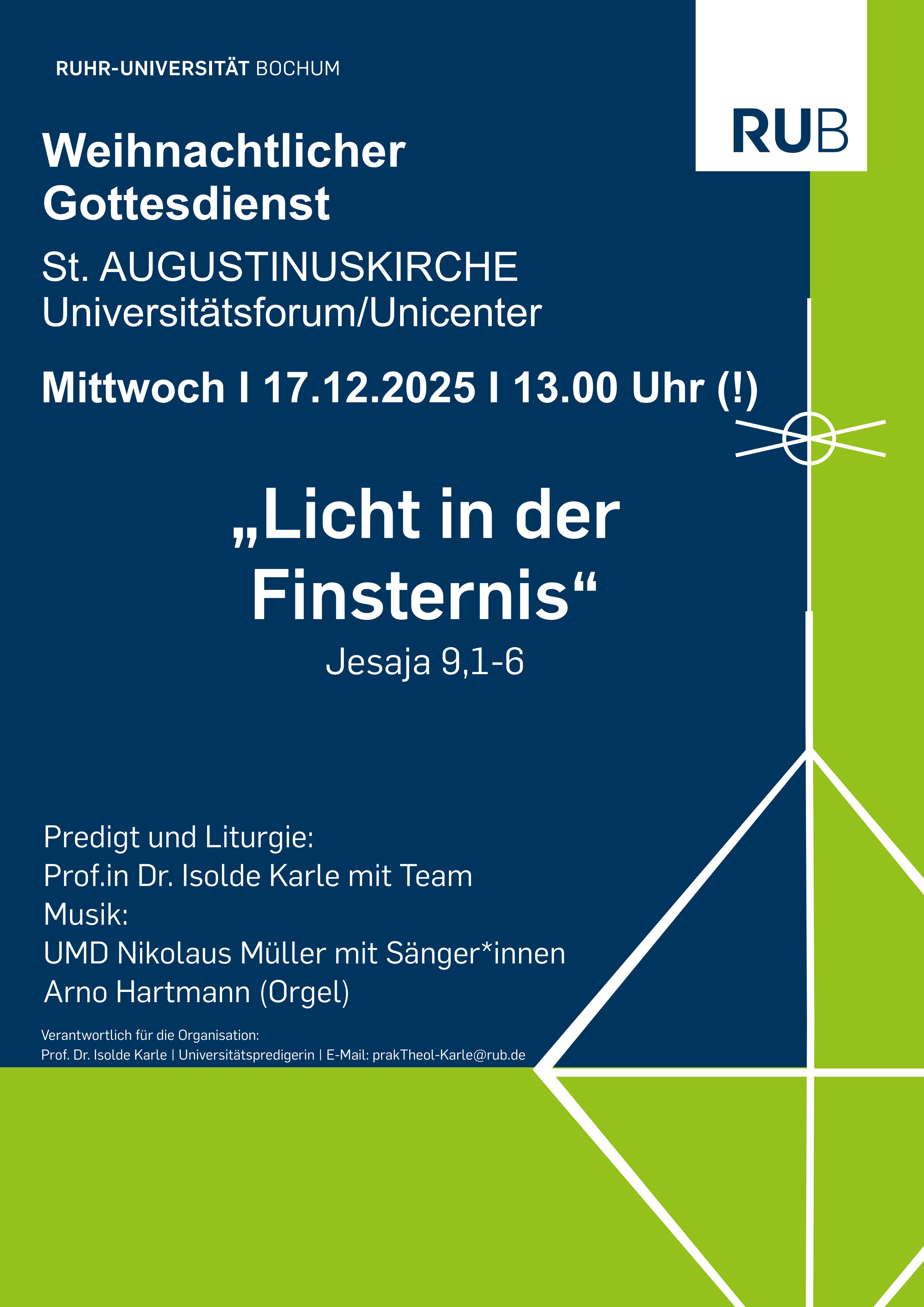 Der Gottesdienst findet am Mittwoch, dem 17.12.2025, um 13:00 Uhr (!) in der Kirche St. Augustinus im Universitätsforum (Unicenter) statt. Der Gottesdienst steht unter dem Titel "Licht in der Finsternis" (Jes 9,1-6).