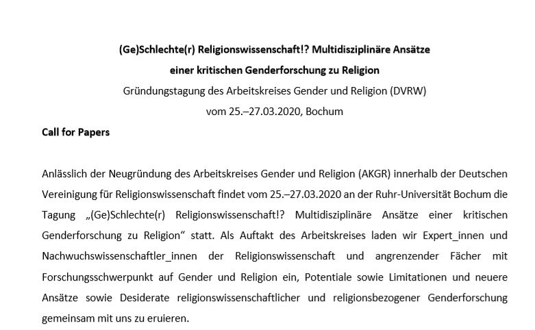 Gründungstagung des Arbeitskreises Gender und Religion (DVRW) vom